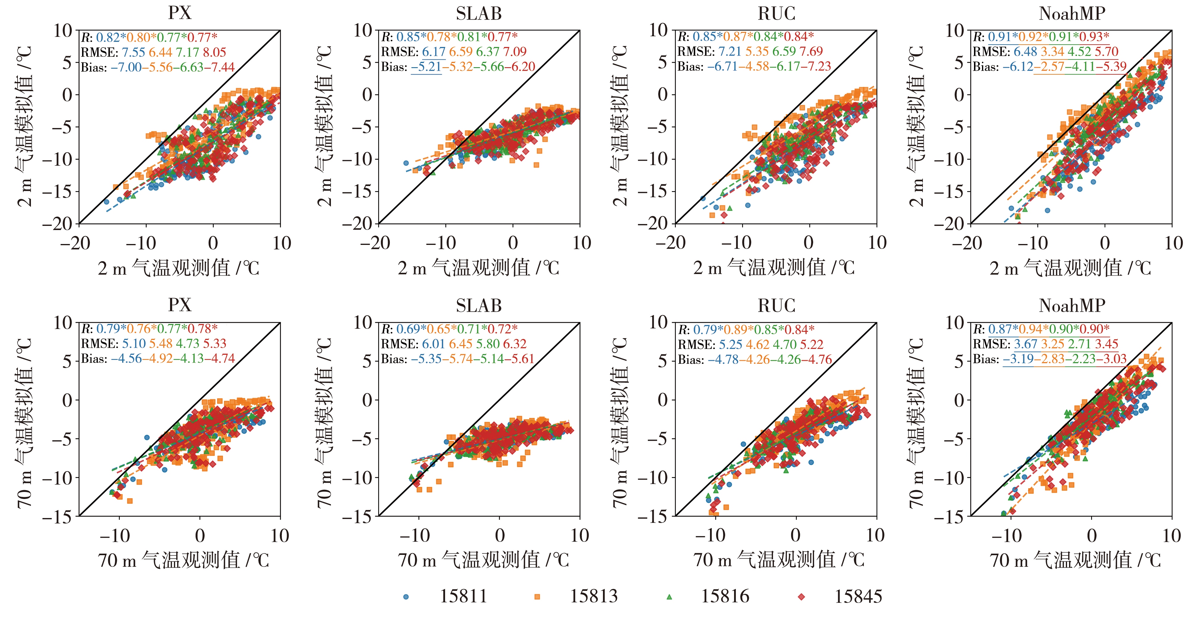 | Fig.4 Scatter plot of T2 and T70 from various land surface schemes against observations during snow-covered period (* indicates significance at the 95% confidence level, the underlined numbers represent the optimal values. The same as below) |