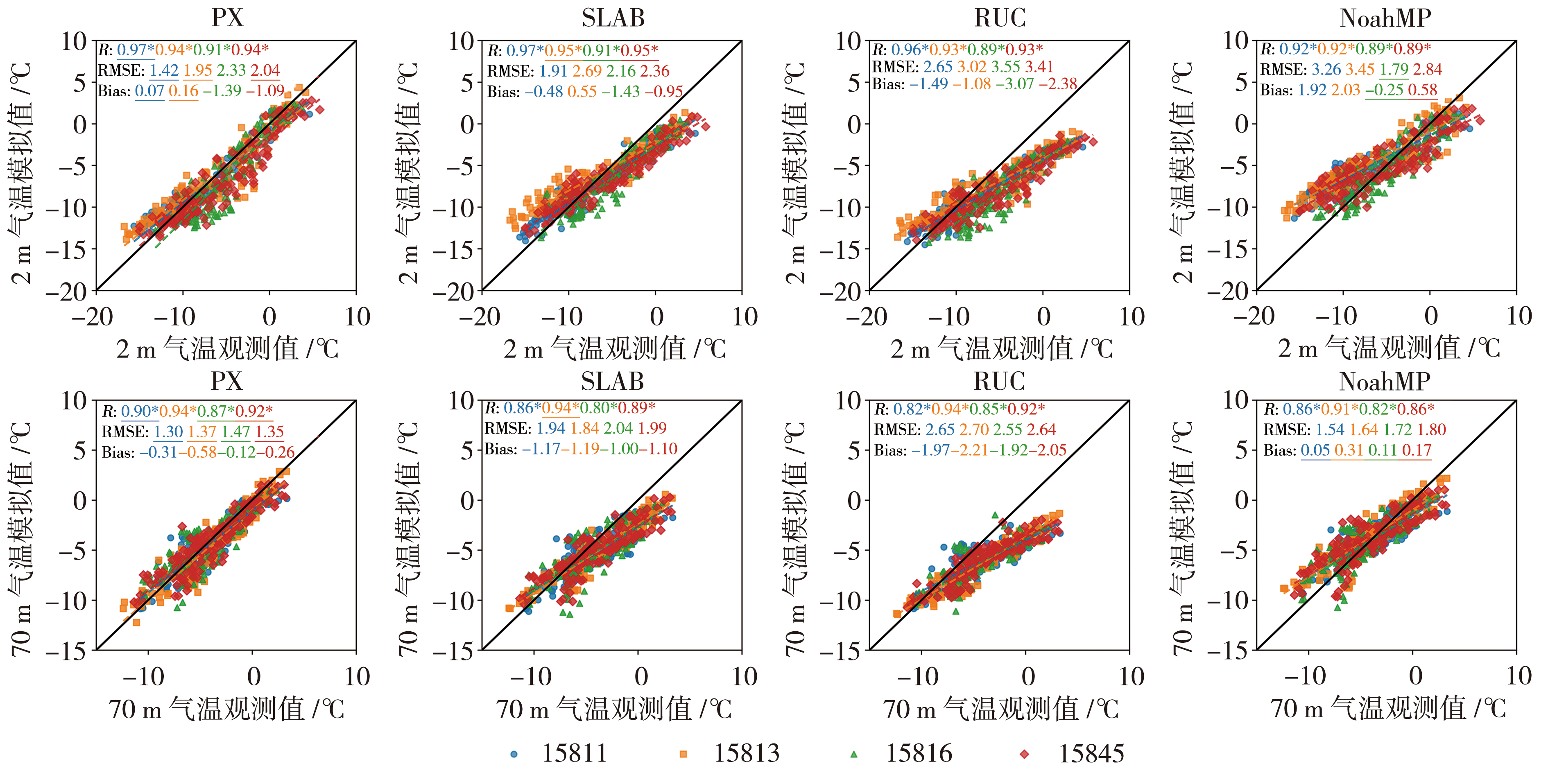 | Fig.7 Scatter plot of T2 and T70 from various land surface schemes against observations during snow-free period |