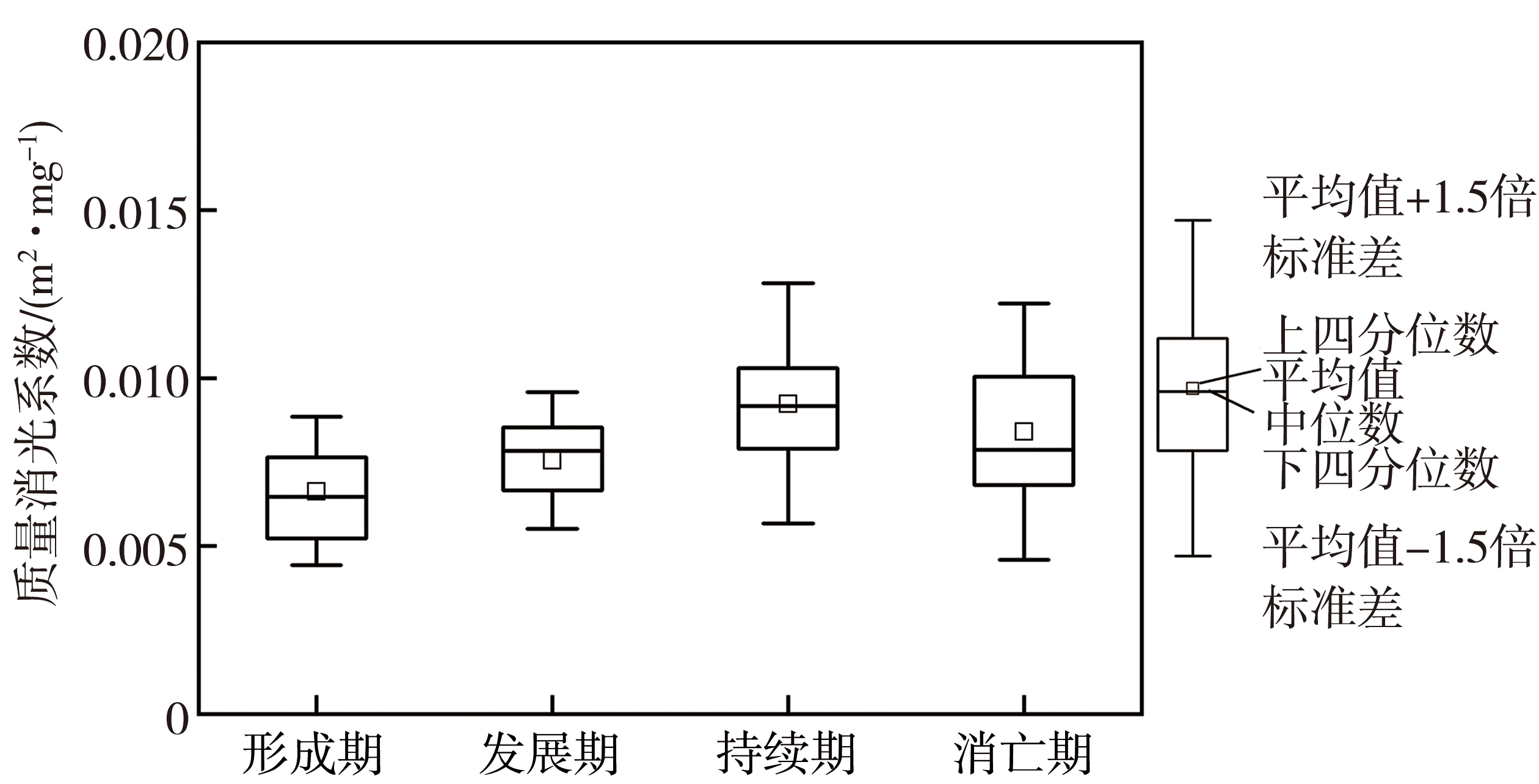 | Fig.5 Box plot of extinction coefficient per unit mass of particulate matter during four stages of the winter haze processes over the Sichuan Basin from 2015 to 2018 |