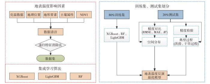 在青海高原地表温度估算过程中,利用RF、XGBoost、LightGBM集成学习算法,结合FY-3D/MWRI亮温数据、地理位置、地形要素、土壤属性和植被状态信息构建青海高原地表温度最优反演模型,并将最优模型结果与典型过程进行检验。图2为具体地表温度反演技术流程。