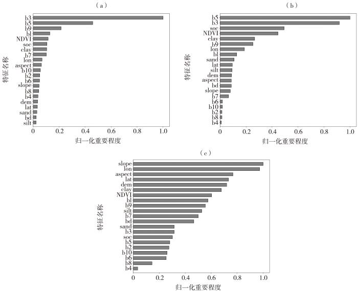 为更好地解释RF、XGBoost和LightGBM模型,对输入因子进行重要性评估。RF模型中通过计算每个特征在所有树中的平均信息增益来衡量特征重要性;而在XGBoost和LightGBM模型中,则通过考虑特征在树的分裂中的增益来评估。RF模型中贡献率大于0.2的特征有3个且b9(0.21)<b5(0.46)<b3(1.00),亮温数据贡献度排名较高[图3(a)];XGBoost模型中贡献率大于0.2的特征有6个且b9(0.25)<clay(0.27)<NDVI(0.45)<soc(0.49)<b3(0.92)<b5(1.00),亮温数据和地形要素贡献度排名较高[图3(b)];LightGBM模型在优化过程中更倾向于选择对预测结果影响更大的特征,而亮温数据的变化相对平稳,导致模型中b8和b4贡献率低于0.20,其余特征贡献率均大于0.2,且排名前五的特征有dem(0.72)<lat(0.73)<aspect(0.77)<lon(0.97)<slope(1.00),地形要素贡献度排名较高[图3(c)]。由此可见,XGBoost模型能够有效地利用亮温数据和地形要素来提升模型性能。