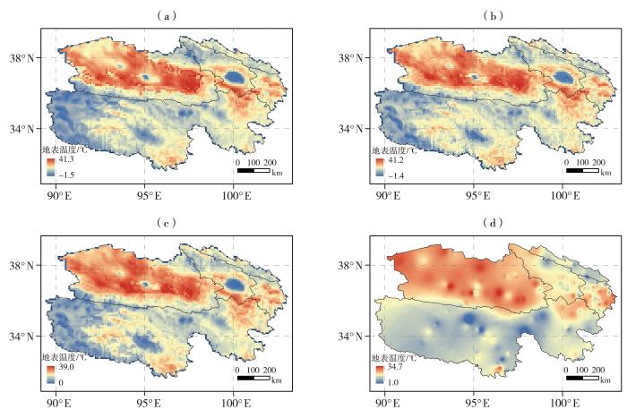 RF(a)、XGBoost(b)、LightGBM(c)模型反演及实际观测(d)的2021—2023年青海高原年平均地表温度空间分布
