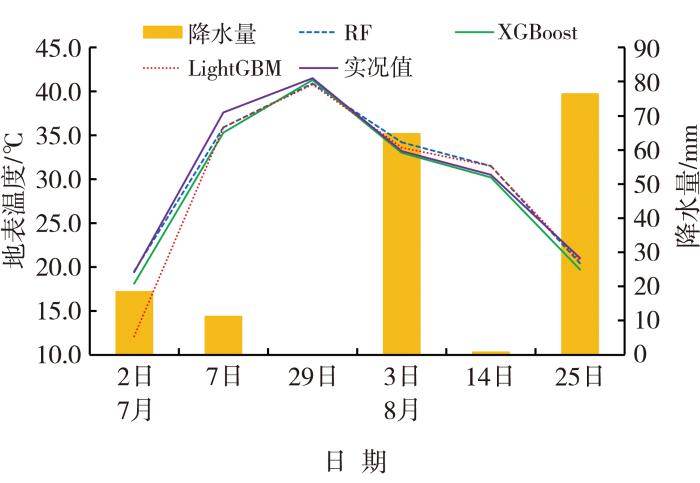 2023年7月上旬至8月中旬青海省东部农业区各地出现不同程度的气象干旱,其中民和县重度及特重度气象干旱持续达20 d,致使部分乡镇出现旱情。选取干旱过程前期(7月2日)、过程发生(7月7日、7月29日、8月3日)、过程结束(8月14日、8月25日)共6个时次卫星遥感数据,基于3种模型反演东部农业区平均地表温度,与该区域气象站点平均地表温度、降水量进行对比分析(图5)。结果显示:干旱过程前期,地表温度较低;随着干旱过程持续,地表温度有所升高;8月25日出现降水,干旱过程结束,地表温度下降明显。其中,RF、XGBoost、LightGBM模型反演值与实测值的偏差分别为0.1、0.9、1.4 ℃;在地表温度上升过程(7月2—29日)和下降过程(7月29日—8月25日)中,RF、XGBoost、LightGBM模型反演值较实测值偏差分别为-0.2~0.7 ℃、0.5~1.3 ℃、-0.1~3.2 ℃。由此可见,在干旱过程中,RF、XGBoost模型优于LightGBM模型。