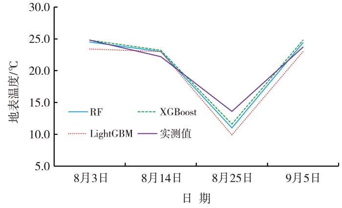 2023年8月18日,青海省玉树藏族自治州通天河流域因前期降水叠加发生洪涝。选取洪涝过程前期(8月3日、14日)、过程发生(8月25日)和过程结束(9月5日)共4个时次卫星遥感数据,基于3种模型反演通天河流域地表温度,与该区域气象站点平均地表温度数据进行对比分析(图6)。结果显示:降水出现前期,地表温度较高;随着降水不断叠加,地表温度有所下降;过程结束后,地表温度回升。其中,RF、XGBoost、LightGBM模型反演值与实测值的偏差分别为0.35、-0.03、1.30 ℃;在地表温度下降过程(8月14—25日)和上升过程(8月25日—9月5日)中,RF、XGBoost、LightGBM模型反演值较实测值偏差分别为0.9~1.0 ℃、0.5 ℃、1.5~2.2 ℃。由此可见,在洪涝过程中,XGBoost模型的表现较为稳定且优于RF、LightGBM模型。