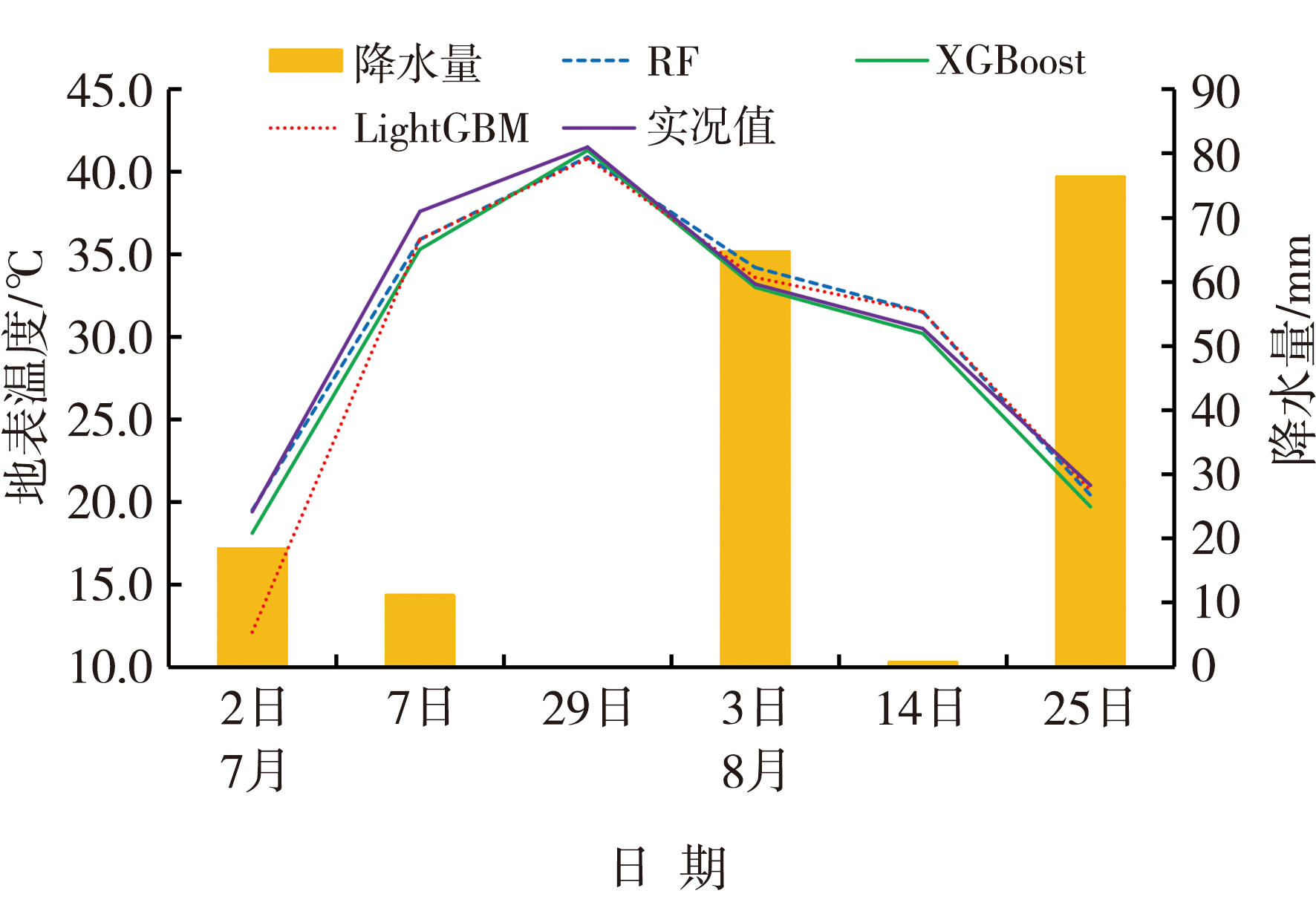 | Fig.5 The average land surface temperature retrieved by three models, measured land surface temperature and precipitation under the drought process in the eastern agricultural region of Qinghai Province from early July to mid-August 2023 |