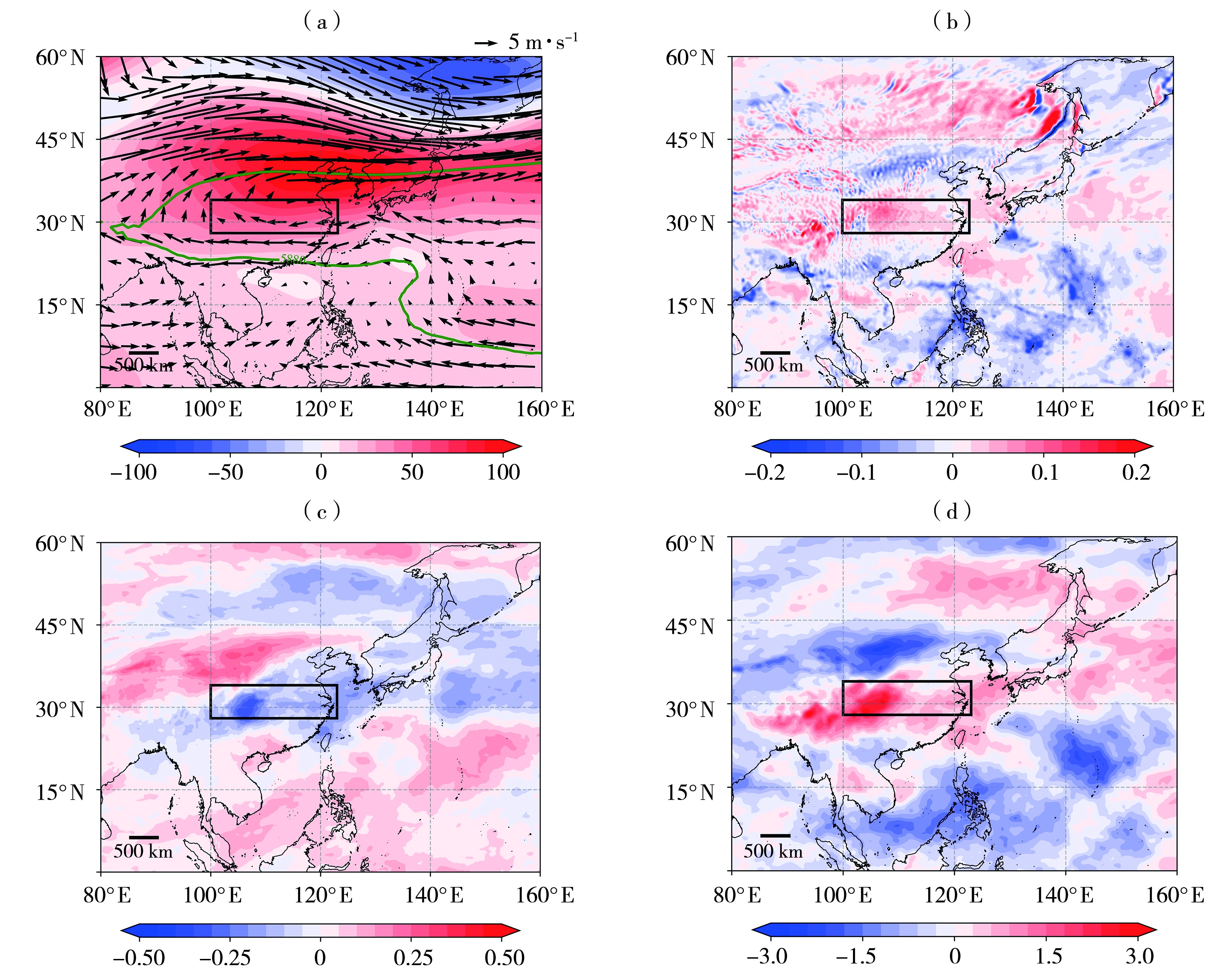 | 图5 2024年8月21日—9月20日500 hPa位势高度场距平(填色,单位:gpm)和风场(矢量,单位:m·s-1)(a)、500 hPa垂直速度异常场(负值表示上升运动,单位:Pa·s-1)(b)、总云量异常场(c)、向下短波辐射异常场(单位:106 J·m-2)(d) (绿色线为5 880 gpm,黑色矩形为长江流域) |