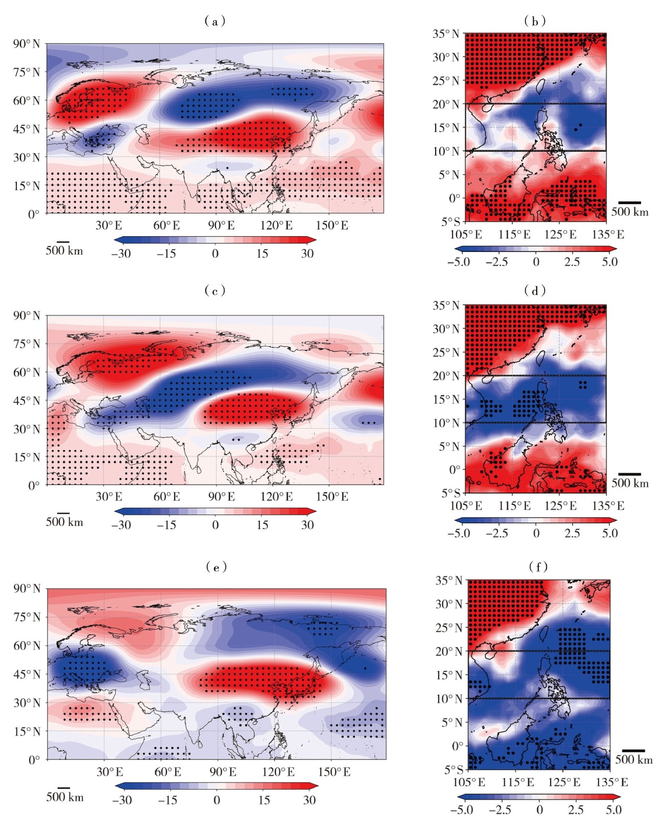 | Fig.7 Spatial distribution of regression coefficients of PC1 onto the 200 hPa geopotential height over the Eurasian continent (Unit: gpm) (a, c, e) and OLR (Unit: W·m-2) over the south China Sea-Philippines-western Pacific region (b, d, f) for the first (a, b), second (c, d), and third (e, f) ten-day periods during August 21-September 20, 1979-2024 (The dotted area passed significance test (P≤0.05), the same as below; the black rectangle denotes the south China Sea-Philippines-western Pacific region) |