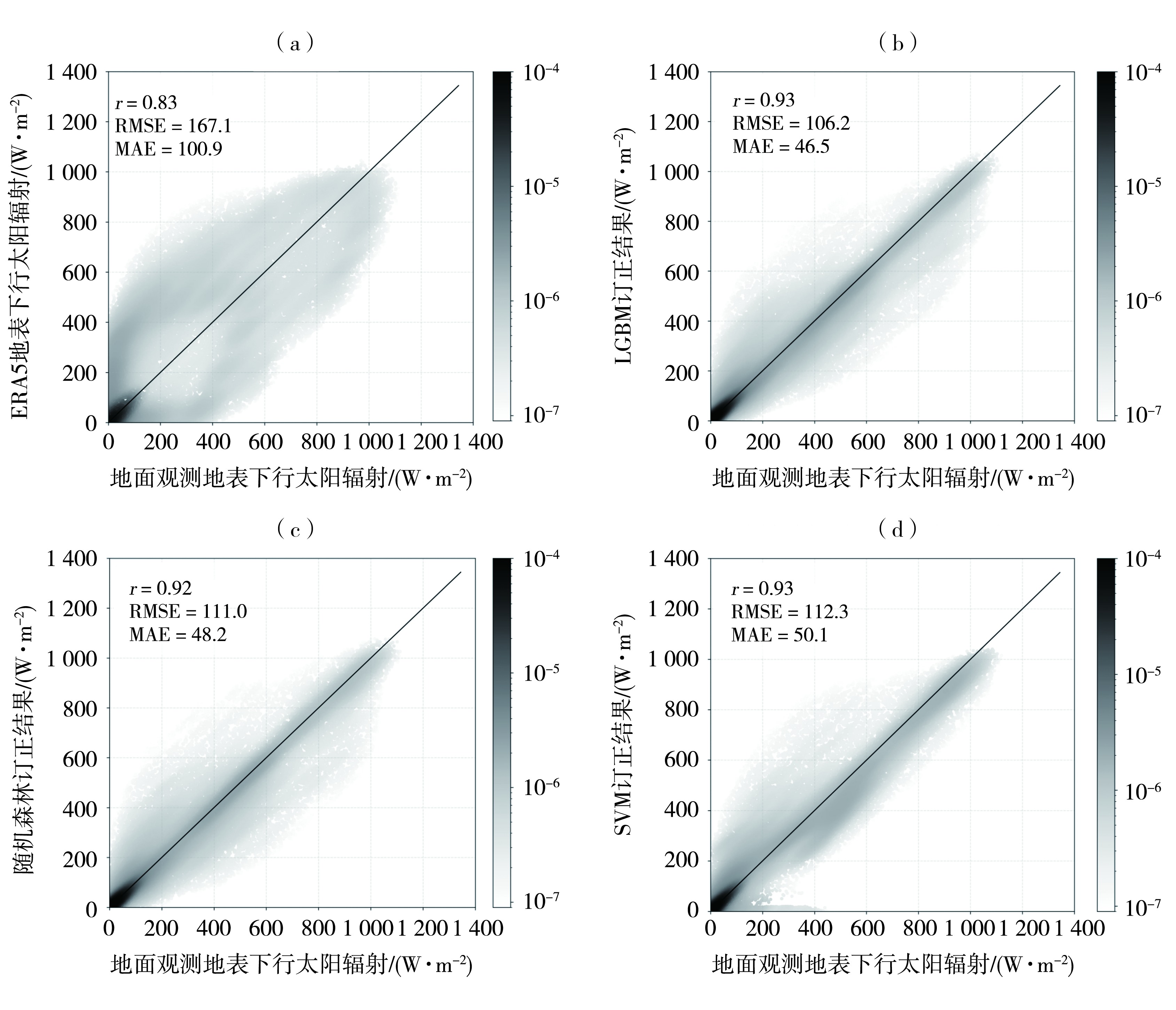 | 图1 未订正及不同机器学习方法订正的2022—2024年ERA5逐小时地表下行太阳辐射与地面站点观测值的散点图 (a)未订正,(b)LGBM订正,(c)RF订正,(d)SVM订正 (黑色实线为1∶1基准线,灰色阴影表示高斯核密度估计值) |