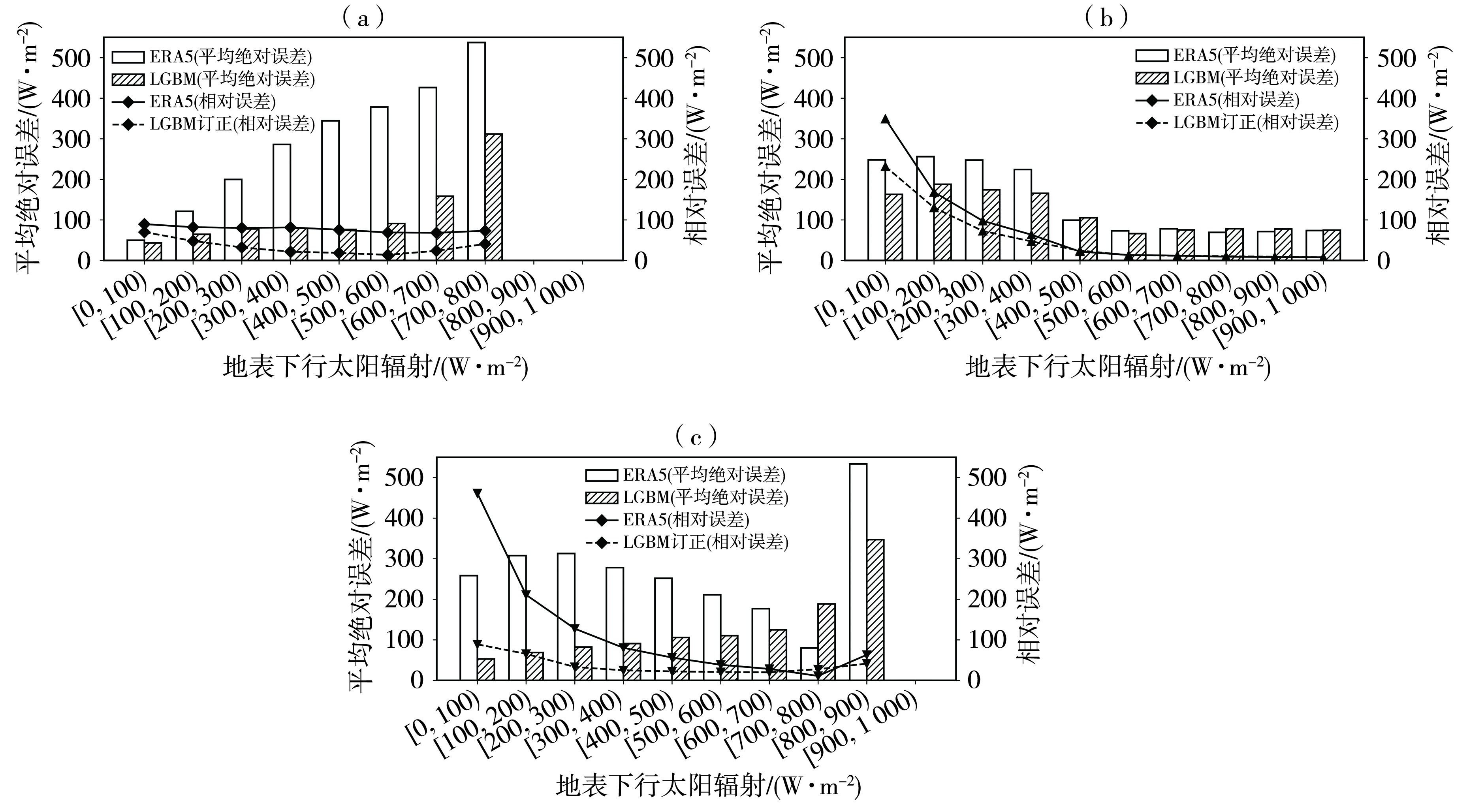 | 图3 不同时刻、不同辐射区间ERA5与LGBM订正的地表下行太阳辐射相较于观测值的平均绝对误差和相对误差 (a) 08:00,(b)12:00,(c)16:00 |