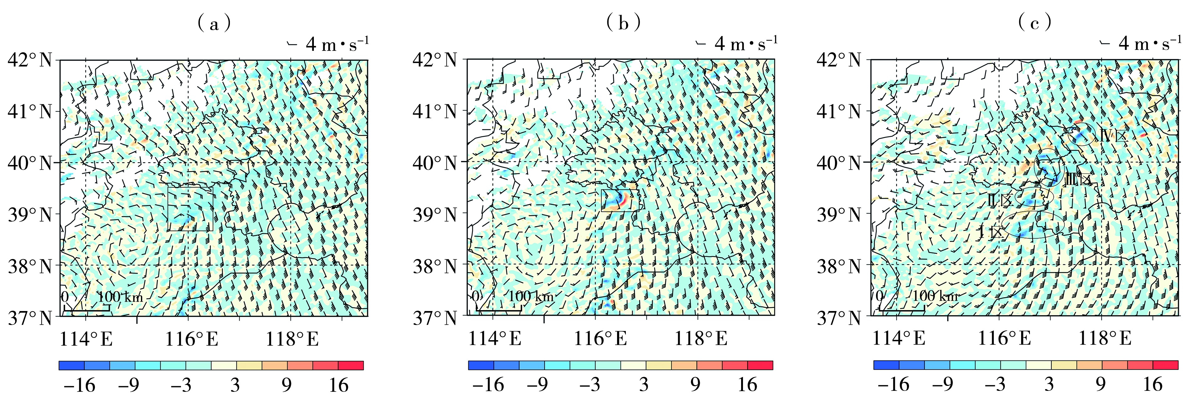 | Fig.6 The simulated 850 hPa wind field (wind vectors,Unit: m·s-1) and divergence (the color shaded,Unit: 10-4 s-1) at 11:00 (a),13:00 (b),15:00 (c) on August 12,2020 (The black box indicates the area of strong convergence,and the ellipses represent the convergence point of the wind field) |