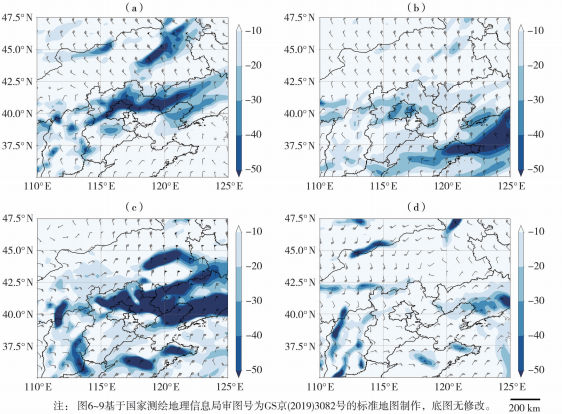 | 图6 2022年10月16日08:00(a)、17日00:00(b)及2024年10月19日02:00(c)、20:00(d)850 hPa冷平流(填色,单位:10-5 K·s-1)和风场(风矢,单位:m·s-1) |
