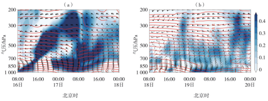 | 图8 2022年10月16—18日(a)及2024年10月18—20日(b)气温(等值线,单位:℃)、风场(风矢,单位:m·s-1)及下沉速度(阴影,单位:Pa·s-1)沿北京(40°N,117°E)的时间-高度剖面 |