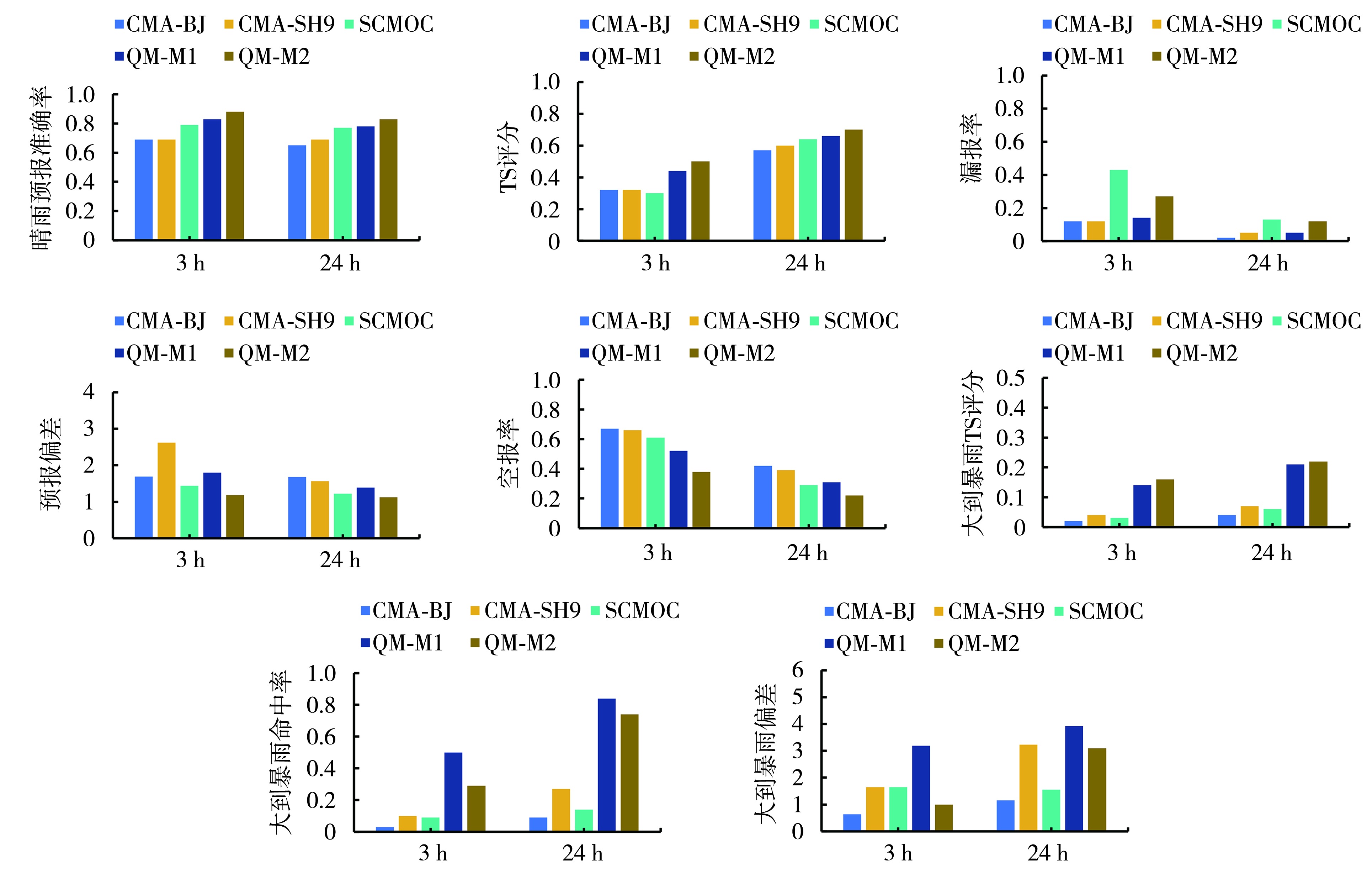 | 图6 青海省2023年7—9月不同预报产品未来24 h时效的3 h和24 h累计降水预报综合检验 |