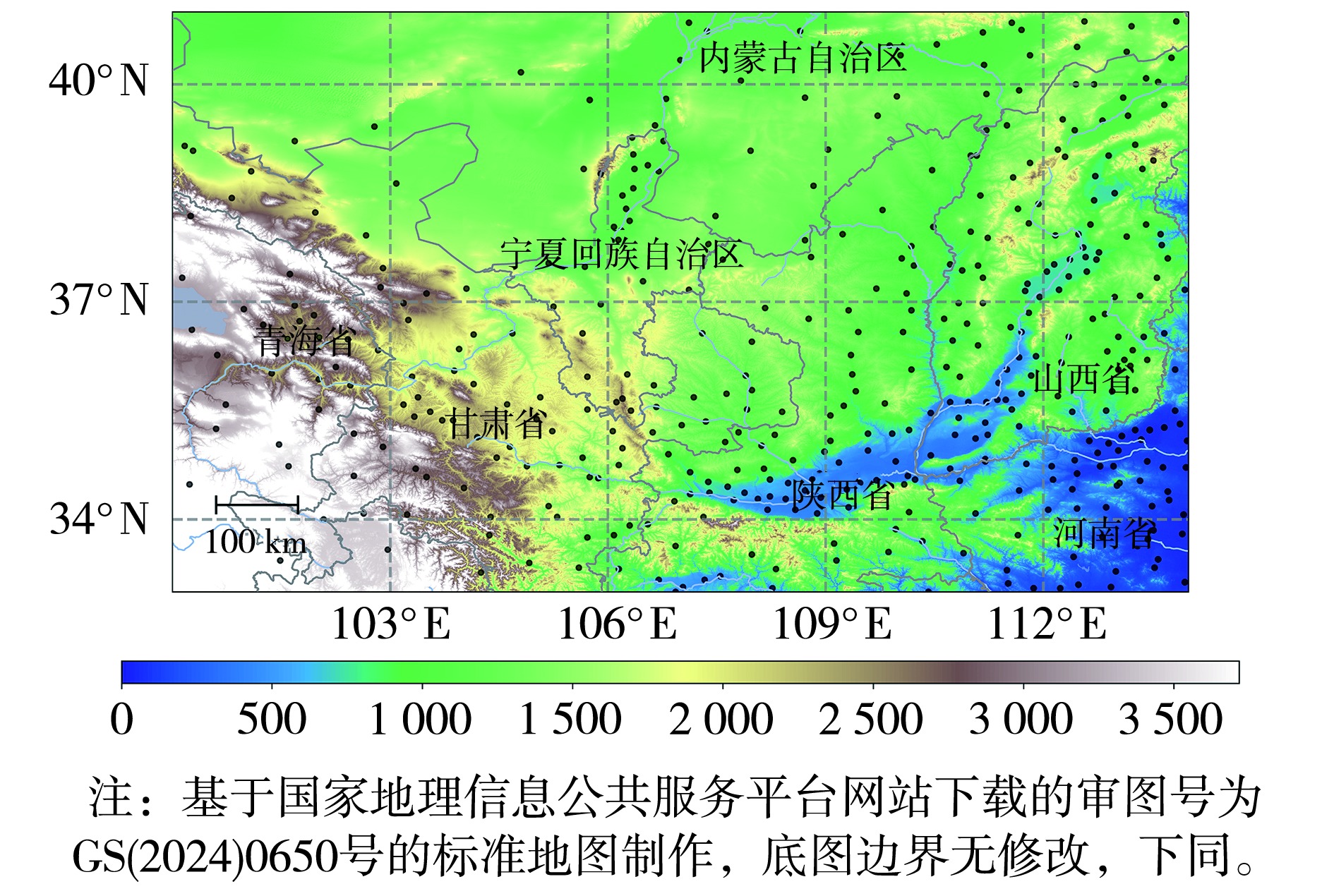 | 图1 黄河中上游地区地形高度(填色,单位:m)及气象观测站点分布(黑色圆点) |