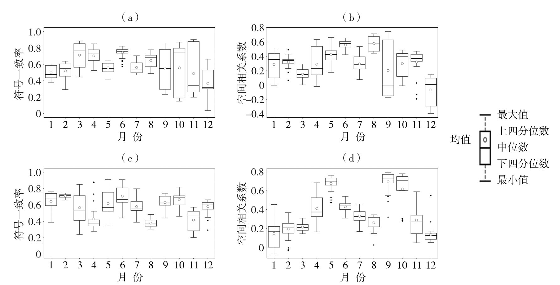 | 图11 1997(a、b)、2001(c、d)年黄河中上游地区SPID-ERA5和逐日MCI正负号一致率(a、c)及空间相关系数(b、d)的箱线图 |