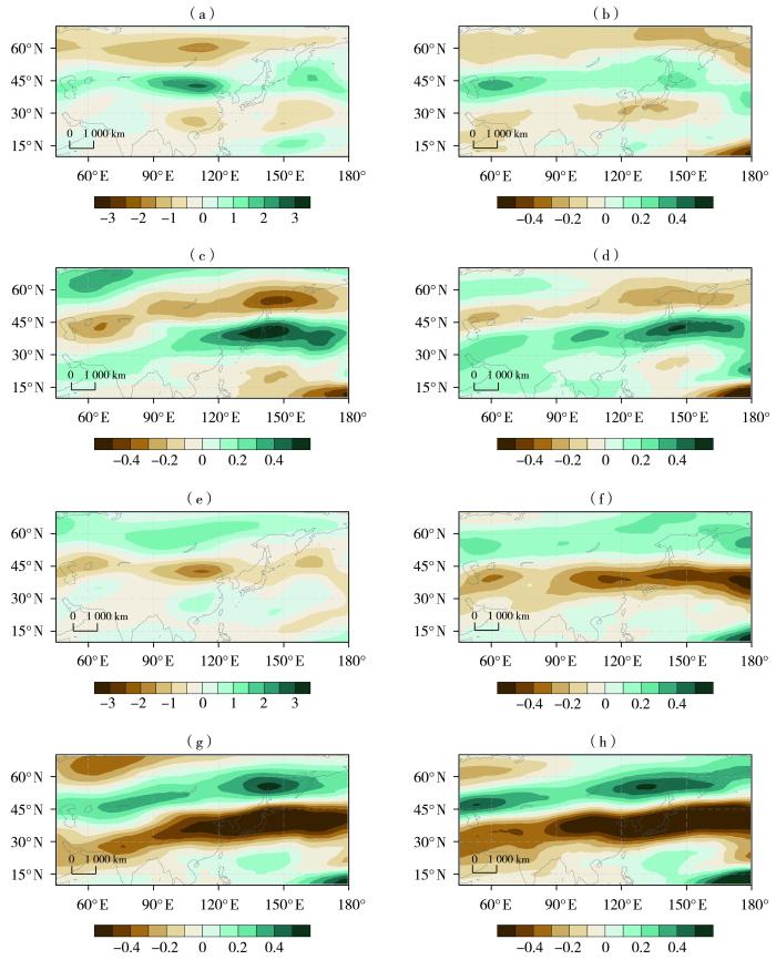 降水偏少年,Sf3对西北太平洋至中亚地区经向遥相关波列的预测与观测[图10(e)]较为一致,表现为热带西太平洋及我国东南沿海西风增强,东北大部、华北北部和新疆北部西风减弱,同时欧亚中高纬45°N—65°N范围西风增强,并在东西两侧各形成一个异常中心[图10(f)]。随着预报时效缩短[图10(g)、(h)],经向遥相关波列逐渐向东南方向移动,Sf5的波列结构已与Sf3存在较大差异,且明显偏离观测。