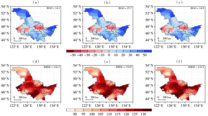 Spatial distribution of multi-year mean bias (model values minus observation) (a, b, c) and RMSE (d, e, f) of SEAS5 forecast of summer total precipitation of Sf3 (a, d), Sf4 (b, e), and Sf5 (c, f) in Heilongjiang during 1993-2023 (Unit: mm)
