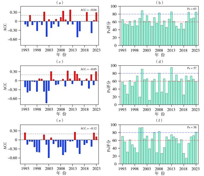 1993—2023年SEAS5模式Sf3(a、b)、Sf4(c、d)、Sf5(e、f)的黑龙江夏季降水量距平百分率的ACC(a、c、e)及Ps评分(b、d、f)年际变化