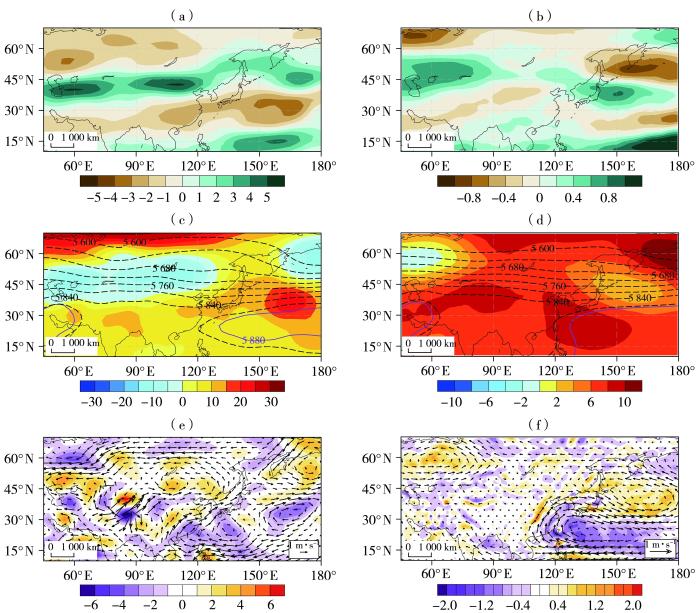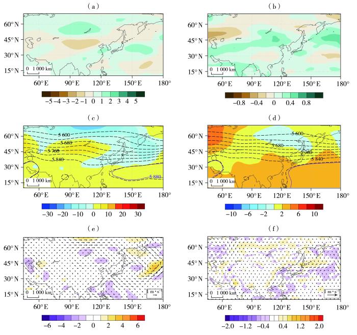 1993—2023年黑龙江夏季降水偏少年中SEAS5模式Sf3低技巧年观测(a、c、e)及模式预报(b、d、f)的200 hPa纬向风场距平(a、b,单位:m·s-1)、500 hPa位势高度场(等值线)及其距平(填色)(c、d,单位:gpm)及850 hPa水平风场(箭矢,单位:m·s-1)及涡度(填色,单位:10-6 s-1)距平(e、f)的合成分析