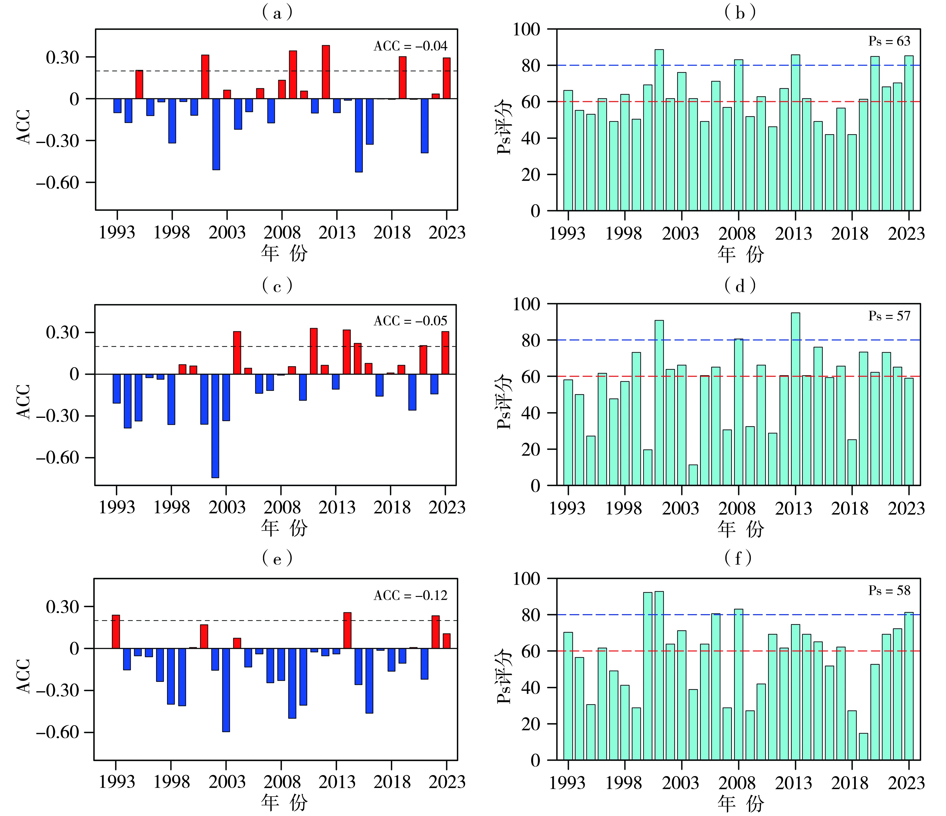 | Fig.5 Interannual variations of ACC (a, c, e) and Ps score (b, d, f) for percentage of anomalies of summer precipitation in Heilongjiang from SEAS5 forecasts of Sf3 (a, b), Sf4 (c, d), and Sf5 (e, f) during 1993-2023 (The black dotted line represents ACC=0.20, the red dotted line represents Ps=60, and the blue dotted line represents Ps=80) |