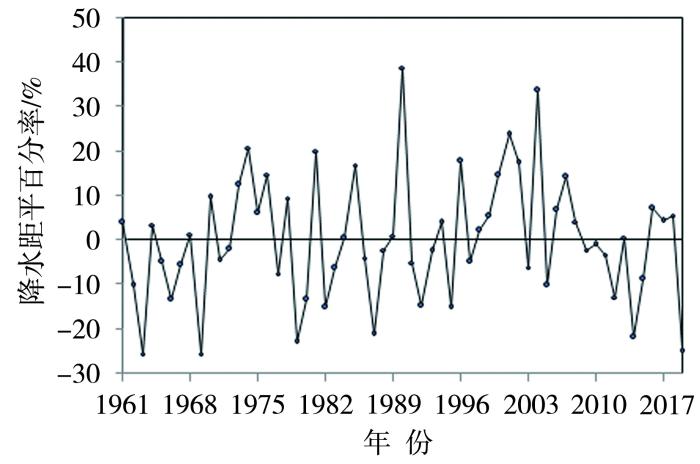 云南省1961—2019年春季平均降水距平百分率逐年变化
