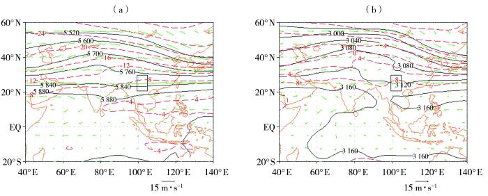2019年春季500 hPa(a)、700 hPa(b)平均位势高度场(黑色实线,单位:gpm)、温度场(红色虚线,单位:℃)及风场(绿色箭矢,单位:m·s-1)分布