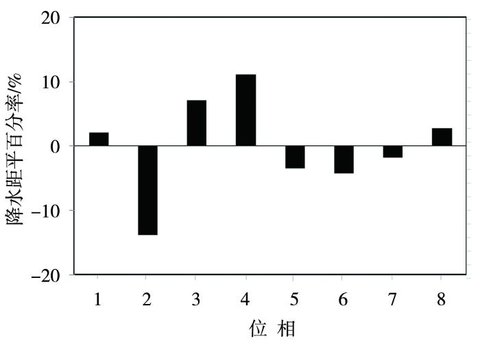 图3为云南125站1979—2018年春季日平均降水距平百分率在MJO第1~第8位相的合成。可以看出,当MJO处于第3、第4位相时,云南春季降水正距平最明显,这与春季影响云南的水汽主要通过孟加拉湾的南支槽输送有关,此时MJO对流活跃区位于印度洋至中南半岛一带,该区域正是春季影响云南降水的重要水汽源地;当MJO位于第1、第8位相时,云南春季降水呈现弱的正距平,此时MJO对流主体位置远在西半球,对云南降水的直接影响有限,反映出该区域春季降水受多种因素共同影响。为了进一步说明MJO第3及第4位相与云南春季降水的关系,选取2008—2018年3—5月逐日降水分别与同期MJO第3、第4位相做点二列相关分析(图略),样本数有1 012个。降水与第3位相的相关系数为0.055,t统计量为1.75,通过0.10的显著性检验;与第4位相的相关系数为0.064,t统计量为2.04,通过0.05的显著性检验。表明MJO第3及第4位相对云南春季降水具有一定的调制作用。