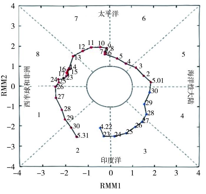 3月云南正处于干季少雨期,降水主要集中在4月下旬,并于雨季开始后逐渐增多。选用2019年4月22日—5月31日的MJO位相图(图4),可以看出该时段MJO对流传播经历了一个完整周期(40 d左右),且整个周期内MJO强度较强。2019年4月22日,MJO处于第2位相西印度洋附近,随后快速通过第2位相及第3位相的中东印度洋;4月28日—5月3日又快速通过第4、第5位相的海洋性大陆;5月4—12日处于第6、第7位相的西太平洋,其中有7 d在第7位相;5月13—29日共17 d一直处于第8、第1位相的西半球和非洲地区。从2019年4月下旬至5月MJO的活动来看,其位置主要集中在第7、第8及第1位相。第3~第6位相对应印度洋到西太平洋广阔的热带洋面,这些区域也是低纬热带地区向云南输送水汽的最主要区域,MJO活动中心处于第3及第4位相时,云南春季降水正距平百分率最为明显(图3),该结论与李汀等(2012)、罗冬莉等(2022)的研究结果一致。但从2019年春季MJO活动位置来看,在第3、第4位相停留时间很短,对流主体主要在遥远的西半球,对云南影响较大的热带洋面对流活动不明显,因此,该年春季MJO的异常位置不利于云南春季降水。