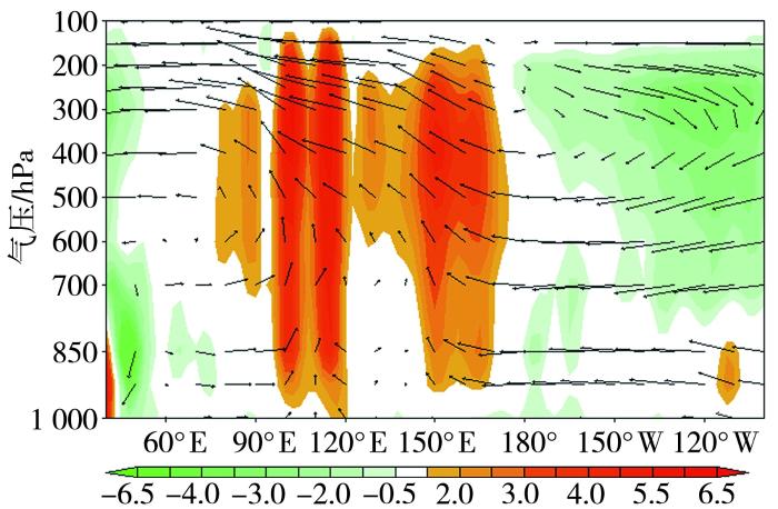 1979—2018年气候平均的3—5月风场(箭矢,单位:m·s-1)和垂直速度(填色,单位:-10-2 Pa·s-1)沿赤道的经度-高度剖面