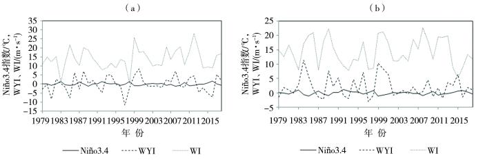 1979—2018年3月(a)及4月(b)Niño3.4指数、WYI、WI的逐年变化