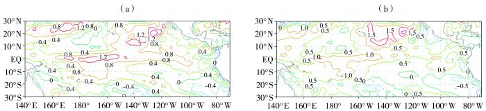 MJO表现为热带地区对流的振荡传播,它与热带海温相互作用。选取热带地区(0°—10°N,80°E—90°E)的OLR进行区域平均,分析与海温场的相关性(图9)。可见,0°—10°N,80°E—90°E的OLR与赤道中东太平洋海温呈显著正相关,当中东太平洋海温偏暖时,OLR较强,此时该区域对流受到抑制;反之,当中东太平洋海温偏冷时,OLR较弱,此时该区域对流活动较为活跃。已有研究指出,0°—10°N,80°E—90°E区域的对流强度对云南春季降水具有重要影响,该区域对流增强有利于云南春季降水增多(吴国雄和孟文,1998;赵尔旭等,2011)。由此可见,赤道中东太平洋海温可通过调制MJO相关对流活动,影响云南春季降水。