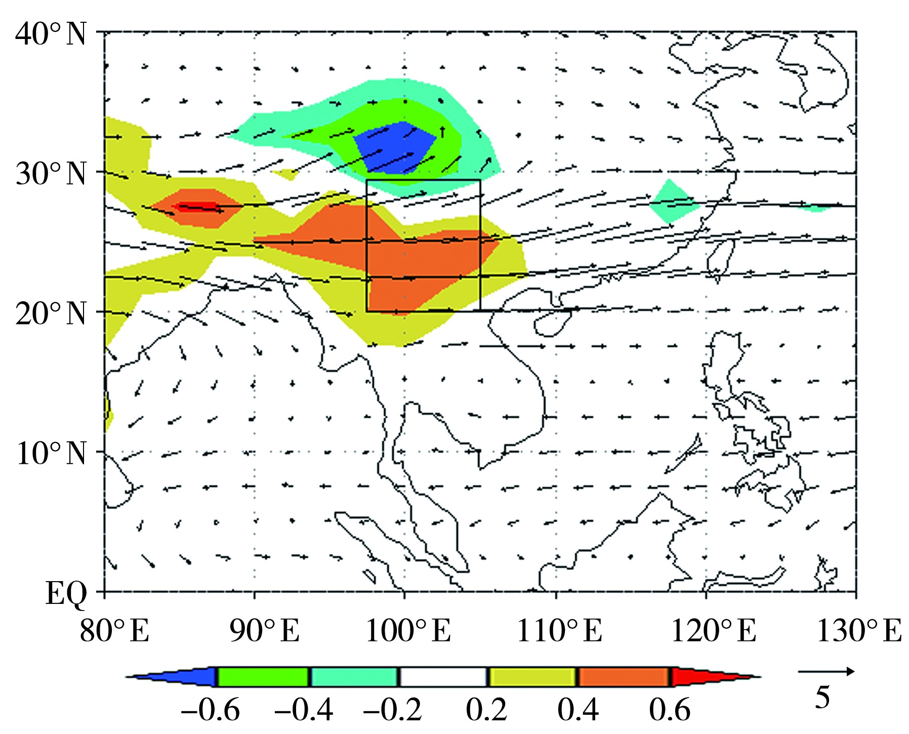 | 图10 2019年春季700 hPa水汽通量(箭矢,单位:10-5 kg·m-1·hPa-1·s-1)与水汽通量散度场(填色,单位:10-8 kg·m-2·hPa-1·s-1)分布 |
