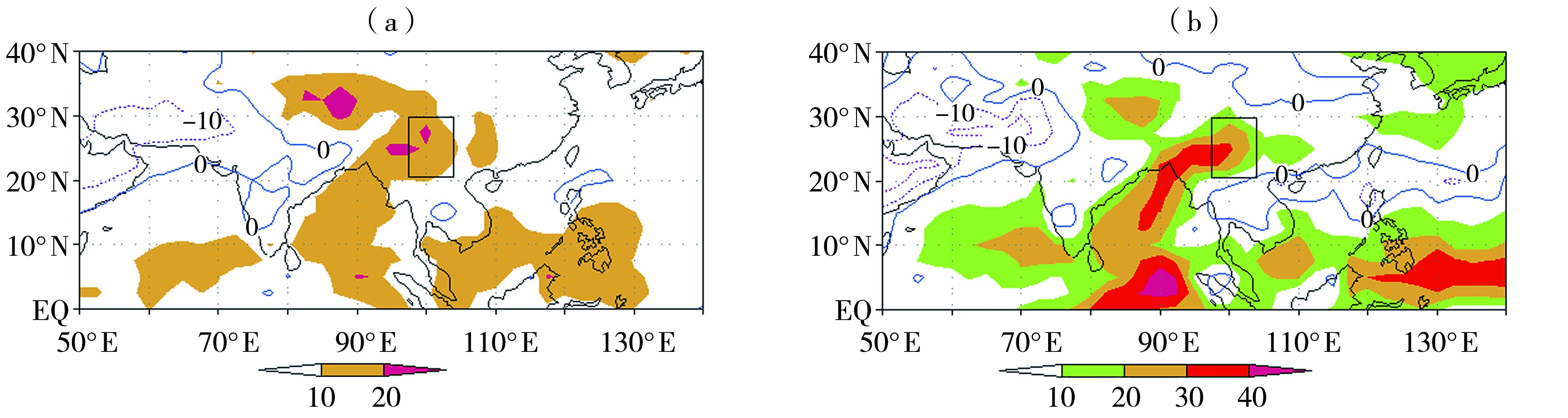 | 图5 2019年春季(a)及5月(b)平均的OLR距平场分布(单位:W·m-2) (填色区域数值大于等于10) |