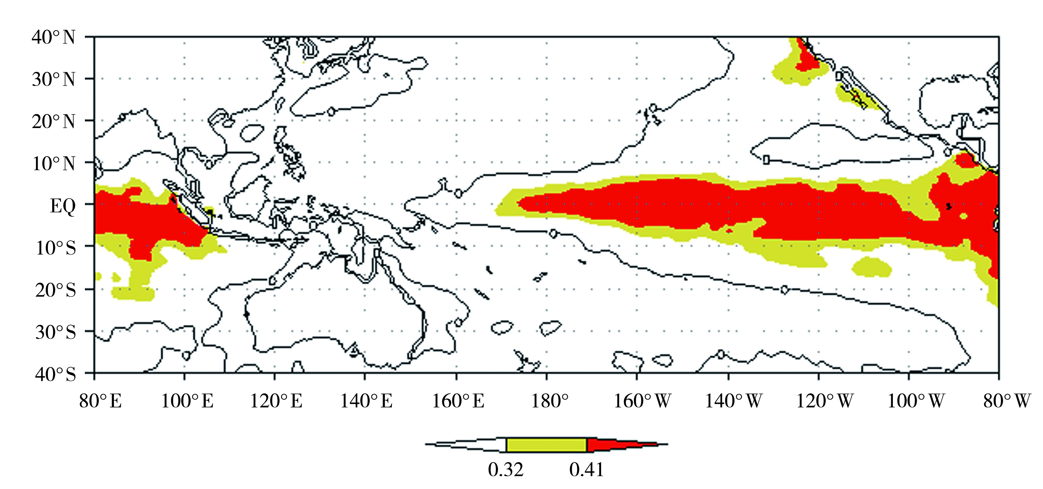 | 图9 1982—2018年0°—10°N,80°E—90°E区域春季平均的OLR与同期海温场的相关系数 (黄色和红色区域分别通过0.05、0.01的显著性检验) |