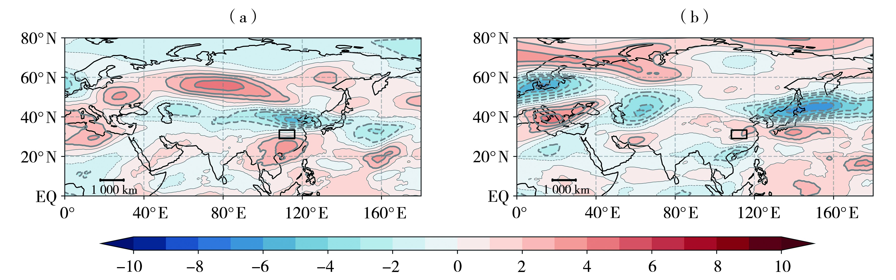 | 图6 夏季典型旱涝转折年5—6月(a)与7—8月(b)200 hPa纬向风差值场合成(单位:m·s-1) (旱转涝年减涝转旱年,下同) |