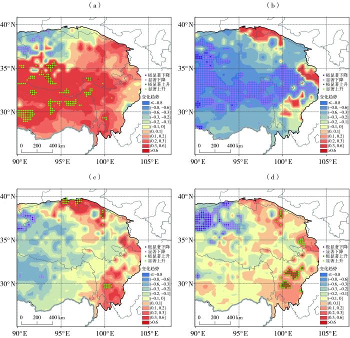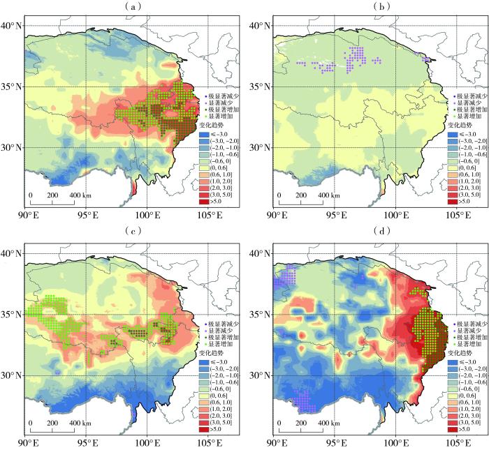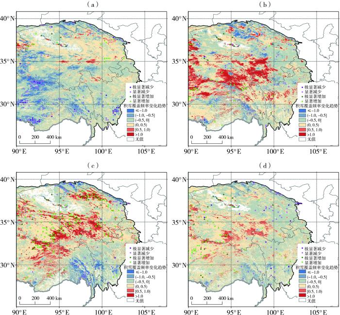 图8为秋、冬、春季平均和年平均积雪覆盖频率变化趋势的空间分布。可以看出,只有秋季高原东部积雪覆盖频率总体表现为减少趋势,北部部分零散区域有增加趋势;年平均积雪覆盖频率在其内陆地区呈较显著增多趋势,南部山区和北部区域有较明显减少趋势;春季积雪覆盖频率变化趋势与年平均积雪覆盖频率类似,高原东部内陆区域以及祁连山附近区域积雪显著增加、东南部山区和北部边缘区域积雪减少,与年平均相比春季积雪变化趋势的幅度更大,同时也更为显著;冬季高原东部内陆区域积雪覆盖总体表现为增加趋势,南部和北部部分零散区域有减少趋势,内陆区域积雪覆盖的增加趋势强于春季。