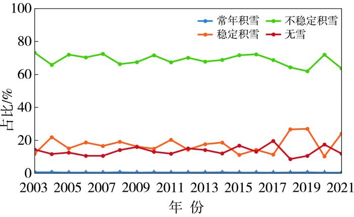 图2为2003—2021年4种积雪类型(无雪、不稳定积雪、稳定积雪和常年积雪)的逐年占比变化。可以看出,2003—2021年,不稳定积雪占比始终最高(平均约68.88%),其次为稳定积雪(平均约17.33%),无雪区域占比平均约13.33%,常年积雪占比最低(平均约0.46%)。各类型积雪占比随时间变化较平稳,仅2018年和2019年稳定积雪占比有明显增加。