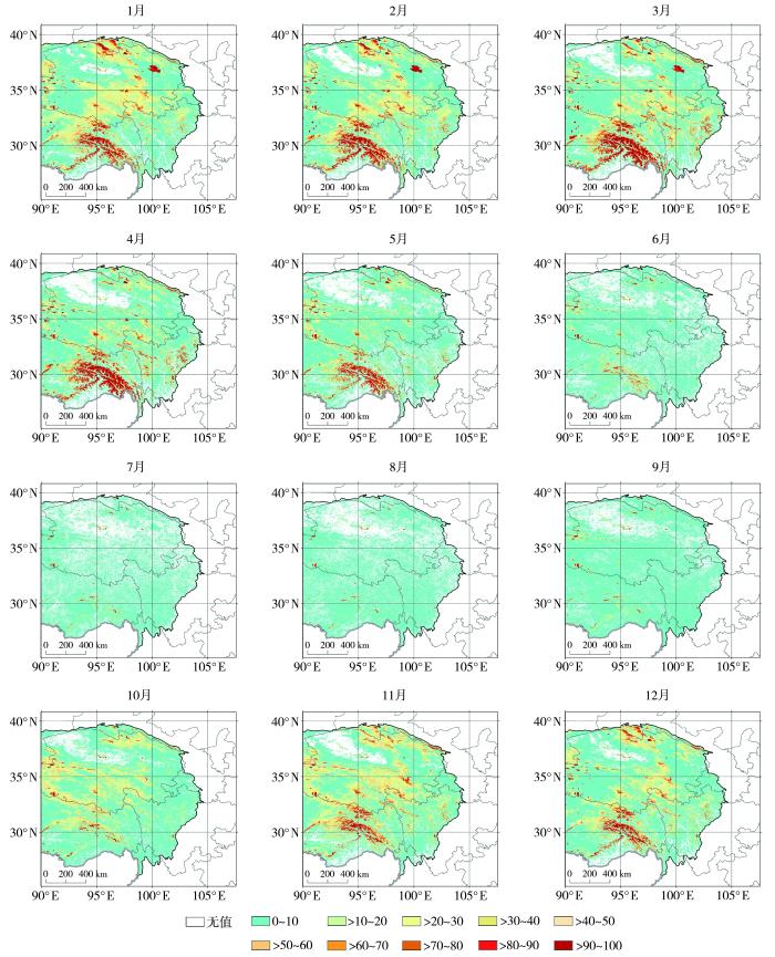 图4为2003—2021年高原东部区域积雪覆盖频率的逐月空间分布。可以看出,积雪覆盖频率较高的区域位于南部喜马拉雅山脉、念青唐古拉山脉和横断山脉,中部内陆部分高海拔区域以及北部的祁连山脉区域,其中南部高大山区的积雪覆盖频率总体最高。研究区主体内陆的大部分区域,积雪覆盖频率较低;北部柴达木盆地、南部和东南部海拔较低的谷地区域,积雪覆盖频率最少。从时间上看,冬季和春季研究区东部的积雪覆盖总体较多,但冬季内陆和北部区域积雪覆盖相比春季更高;春季内陆地区积雪开始减少,但3月和4月左右南部高海拔地区积雪覆盖相对冬季却明显增加,随后高原东部积雪覆盖整体开始减少;秋季积雪又开始增加,特别是较高海拔区域增加较为明显,11月左右积雪覆盖增加最为明显。