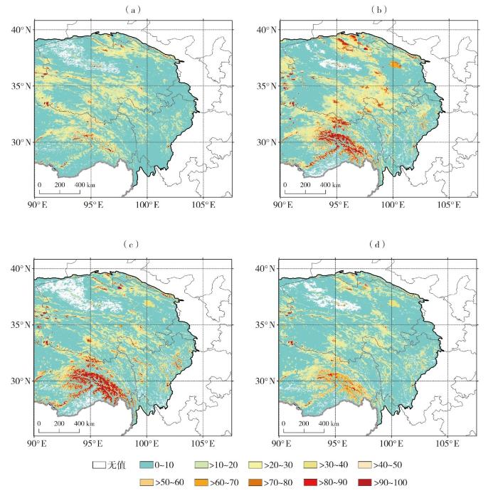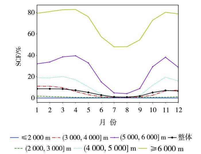 中低海拔区域(海拔4 000 m以下),积雪覆盖频率演变的单峰特征主要与高原冬季低温条件有利于积雪出现和保持有关,因此冬季气温较低时积雪覆盖频率较高;较高海拔区域(海拔4 000 m以上)气温相对更低,秋季、冬季以及春季气温条件都有利于积雪保持。冬季高原处于西风气流控制下,基本受冷高压控制,天气以晴好为主,降雪相对较少;秋季和春季是高原地区的过渡季节,降雪过程较多可能是导致高海拔区域积雪覆盖频率峰值出现在秋季和春季的原因(除多等,2017);海拔越高气温越低,春季有利于积雪覆盖积累的时间持续越长,所以海拔越高的区域春季积雪覆盖频率峰值出现的时间也越晚。