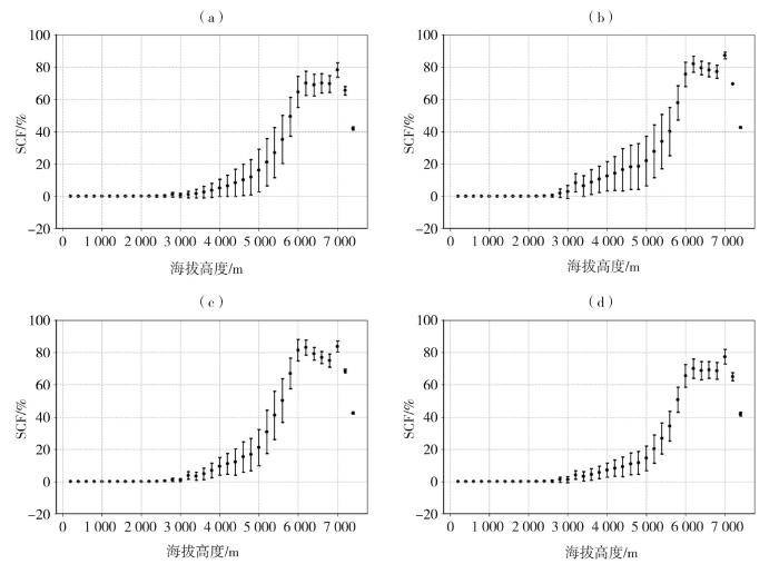 秋、冬、春季平均和年平均积雪覆盖频率在不同海拔高度上的平均值以及年际变率也有明显差别(图7)。积雪覆盖频率随海拔高度上升逐渐增加,在海拔6 000~7 000 m左右达到最大值;随后海拔再升高之后,积雪覆盖频率反而下降,可能与该区域大多为山峰顶部有关,高大山峰顶部坡度较为陡峭,加之该高度上风速较大,不利于积雪附着。海拔3 000 m以下以及6 000 m以上区域积雪覆盖频率年际变率标准差总体较小,海拔3 000~6 000 m区域其年际变率标准差较大,可能原因是低海拔区域积雪较少,而较高海拔区域为常年积雪区,而3 000~6 000 m区域的积雪覆盖频率可能受气温或降水等因素变化影响导致年际变率较大。