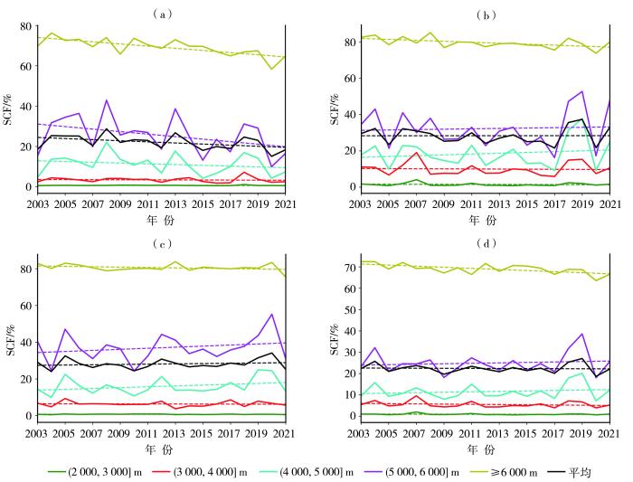 总体来看,秋季平均和年平均积雪覆盖频率在各海拔高度上的平均值总体相当,比其他两个季节的平均积雪覆盖频率略小,但秋季其年际变率相对更大。冬季积雪覆盖频率的年际变率大于春季,海拔3 000~5 000 m区域冬季积雪覆盖频率较高,体现出冬季低温有利于该区域的积雪累积覆盖;但在海拔5 000~6 000 m区域,春季积雪覆盖频率反而高于冬季,该区域主要位于高原南部的高大山脉区,可能原因是该区域冬、春季气温都较低,而春季高原南部水汽较丰富,降雪较多,从而有利于春季积雪覆盖频率提高,这与图6中的结论类似。