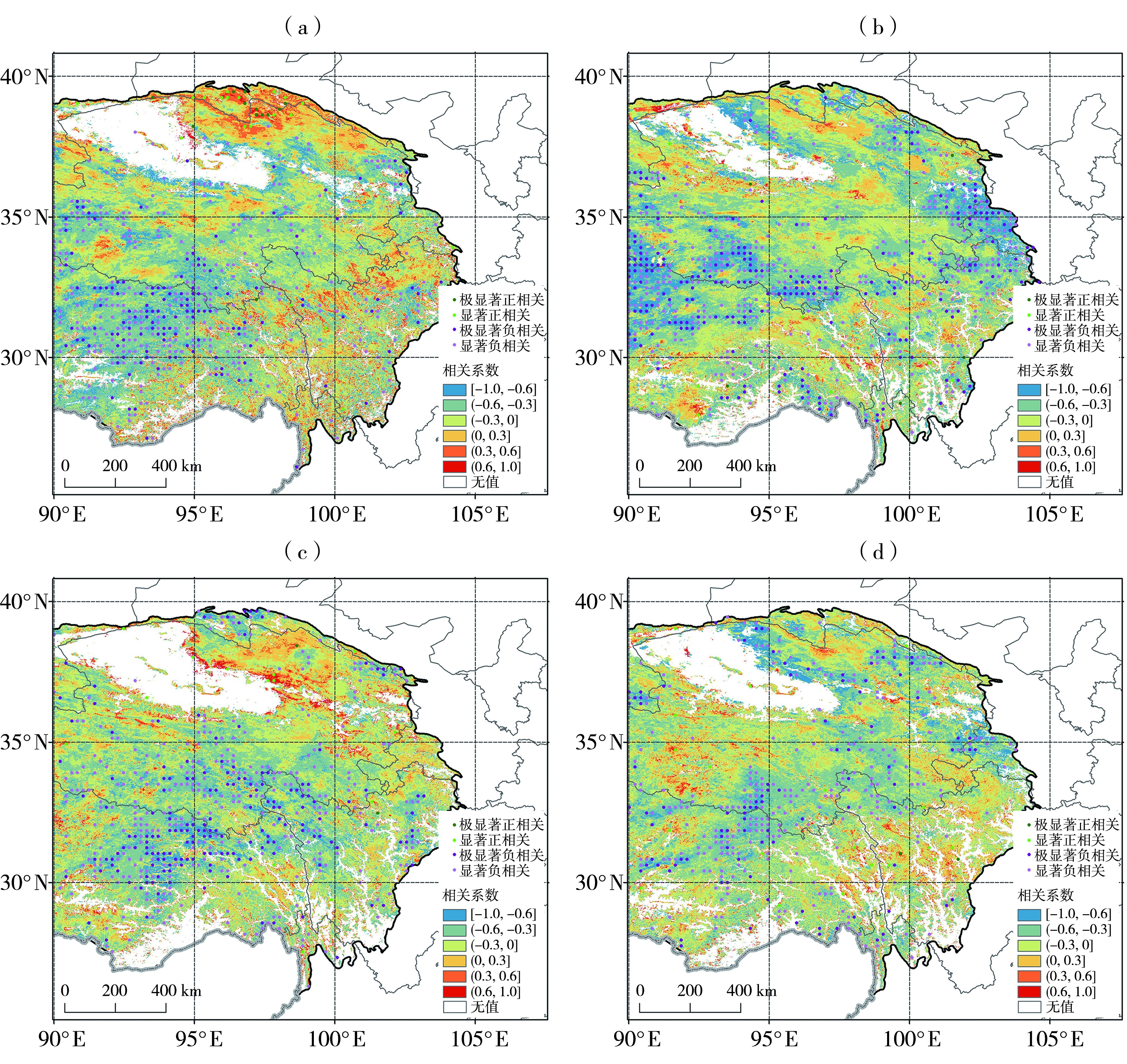 | 图10 季节及年平均积雪覆盖频率与同期气温相关系数空间分布 (a)秋季,(b)冬季,(c)春季,(d)年 |
