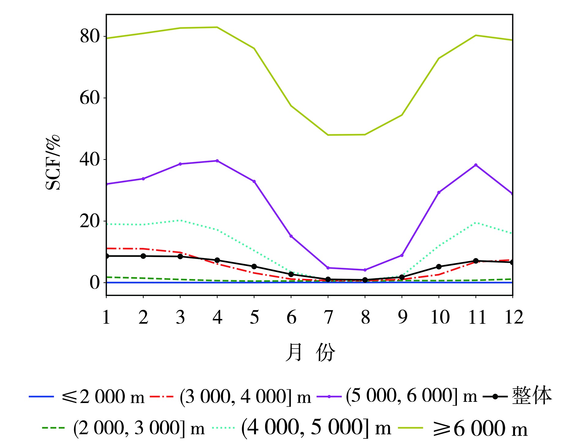| 图5 2003—2021年高原东部不同海拔高度逐月积雪覆盖频率演变 |