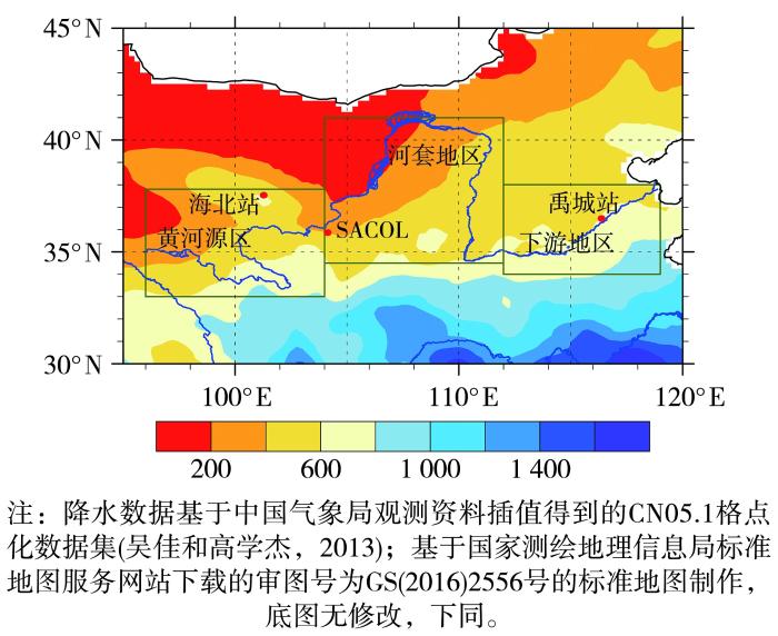 黄河流域位于32°N—42°N、95°E—120°E之间,东西长约1 900 km,南北宽约1 100 km,流域面积7.95×105 km2,流域内气象要素空间分布差异较大,下垫面类型复杂多变。为研究黄河流域内蒸散的变化特征,本文依据王澄海等(2022)方法将黄河流域划分为黄河源区(33°N—37°N,96°E—104°E)、河套地区(34.5°N—41°N,104°E—112°E)及黄河下游地区(34°N—38°N,112°E—119°E)分别进行分析,具体划分见图1(绿色框)。其中,黄河源区位于青藏高原东北部的半干旱高寒地区,海拔高、支流多、季风影响较小,是黄河径流量的主要供给地区,年均降水量为400~800 mm;中部河套地区横跨河套平原、鄂尔多斯高原、毛乌素沙地和黄土高原,地处我国西北部,属于干旱半干旱区,年均降水量较少(100~500 mm)且空间差异大;下游位于半湿润区,流域内山西、河南、山东三段受季风影响显著,降水相对较多,可达600~1 000 mm。