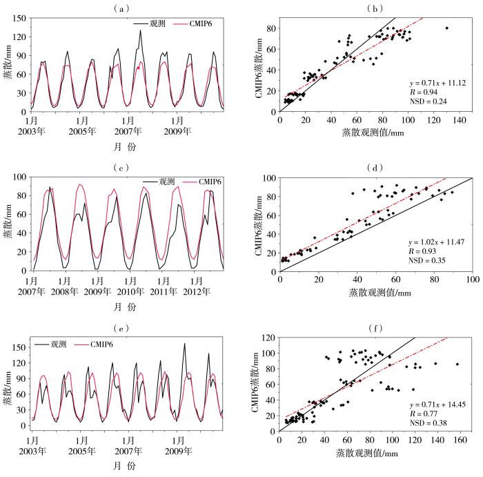 2003年1月—2010年12月海北(a、b)和禹城(e、f)站、2007年1月—2012年12月SACOL站(c、d)蒸散观测值与CMIP6多模式集合平均的逐月变化(a、c、e)及散点图(b、d、f)