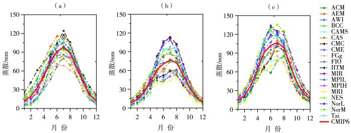 基于CMIP6多模式集合平均及各模式模拟结果的1980—2014年黄河流域源区(a)、河套(b)和下游(c)地区蒸散的月际变化