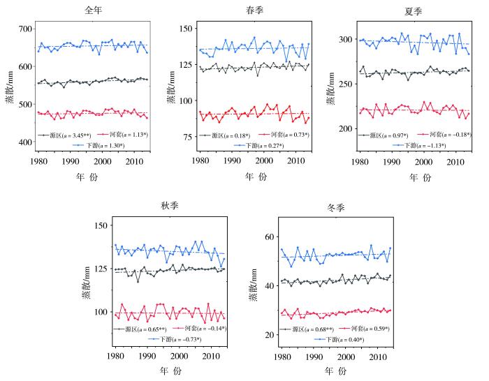 基于CMIP6多模式集合平均的1980—2014年黄河源区、河套地区和下游地区全年和不同季节蒸散年际变化