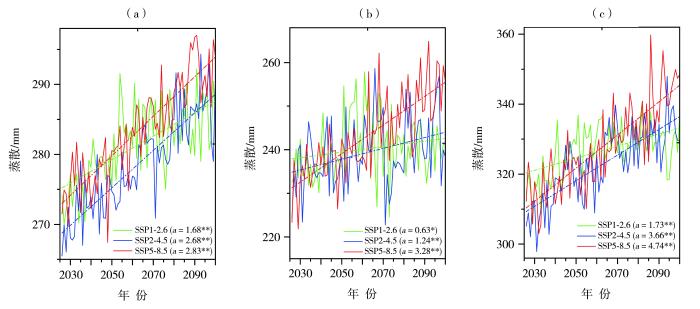 不同排放情景下基于CMIP6多模式集合平均的2026—2100年夏季黄河源区(a)、河套地区(b)和下游地区(c)蒸散的年际变化