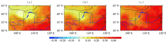 图9为未来(2026—2100年)3种不同排放情景下黄河流域夏季蒸散变化趋势的空间分布。可以看出,伴随着人为排放的增大,蒸散在黄河流域普遍升高。其中,黄河下游区域蒸散的上升趋势最明显,在SSP5-8.5排放情景下可超过0.4 mm·a-1;在SSP1-2.6和SSP2-4.5排放情景下,河套地区西北部的上升趋势最低,主要集中在0.1 mm·a-1左右。总体上,伴随人为排放加剧,温室气体浓度增加,导致全球变暖,黄河流域蒸散变得更不稳定,使气候异常变得更严重。