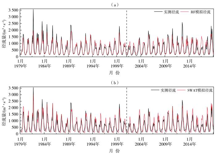 1979—2018年黄河源区唐乃亥站实测月径流量与RF模型(a)、SWAT模型(b)的模拟结果对比